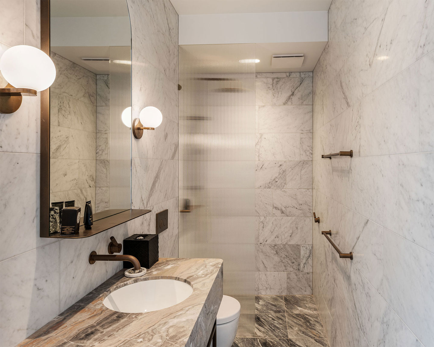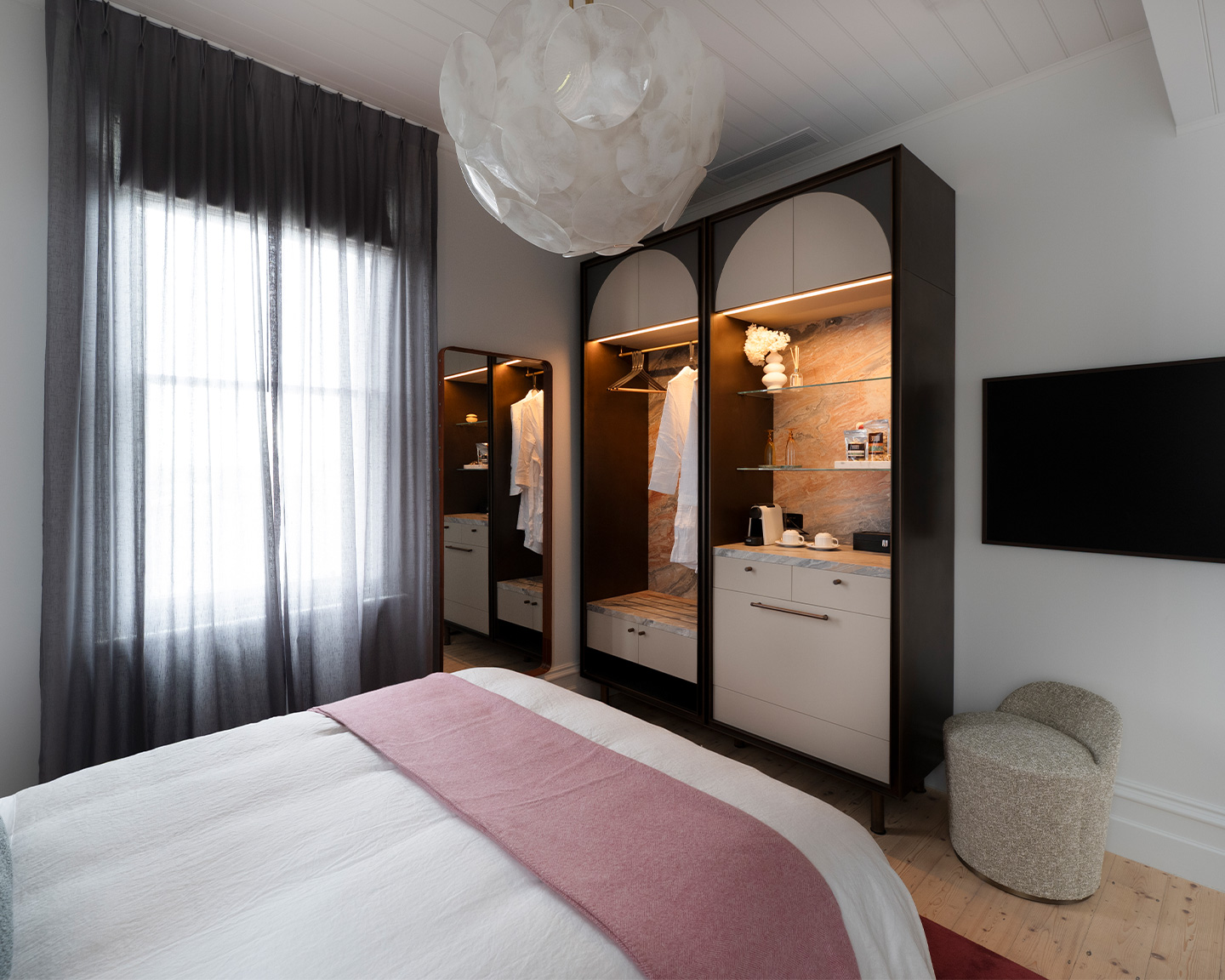 A serene retreat, this idyllic bay-view suite captures the essence of coastal relaxation. With a coveted north-facing view, it offers a sweeping lookout over Queenscliff and the tranquil waters of Swan Bay. Original Baltic pine flooring, a luxurious marble ensuite, and bespoke cabinetry in bronze , leather, and marble create a warm, refined atmosphere designed for complete unwinding.