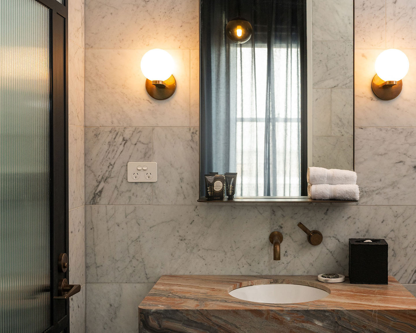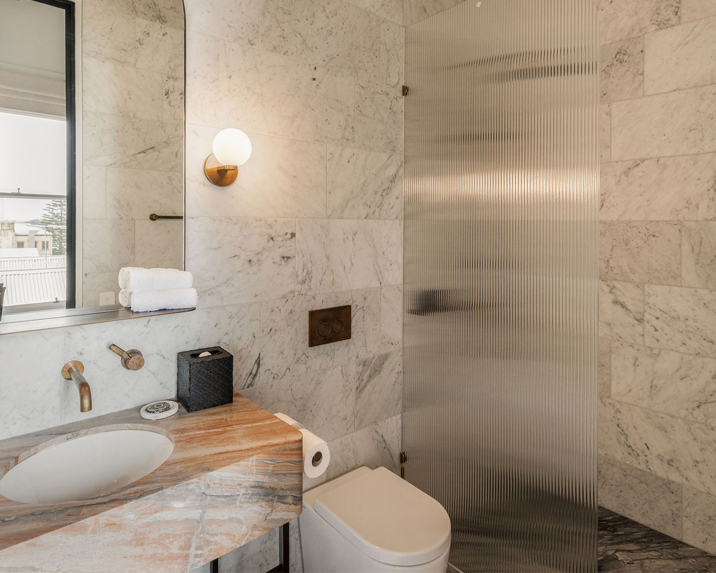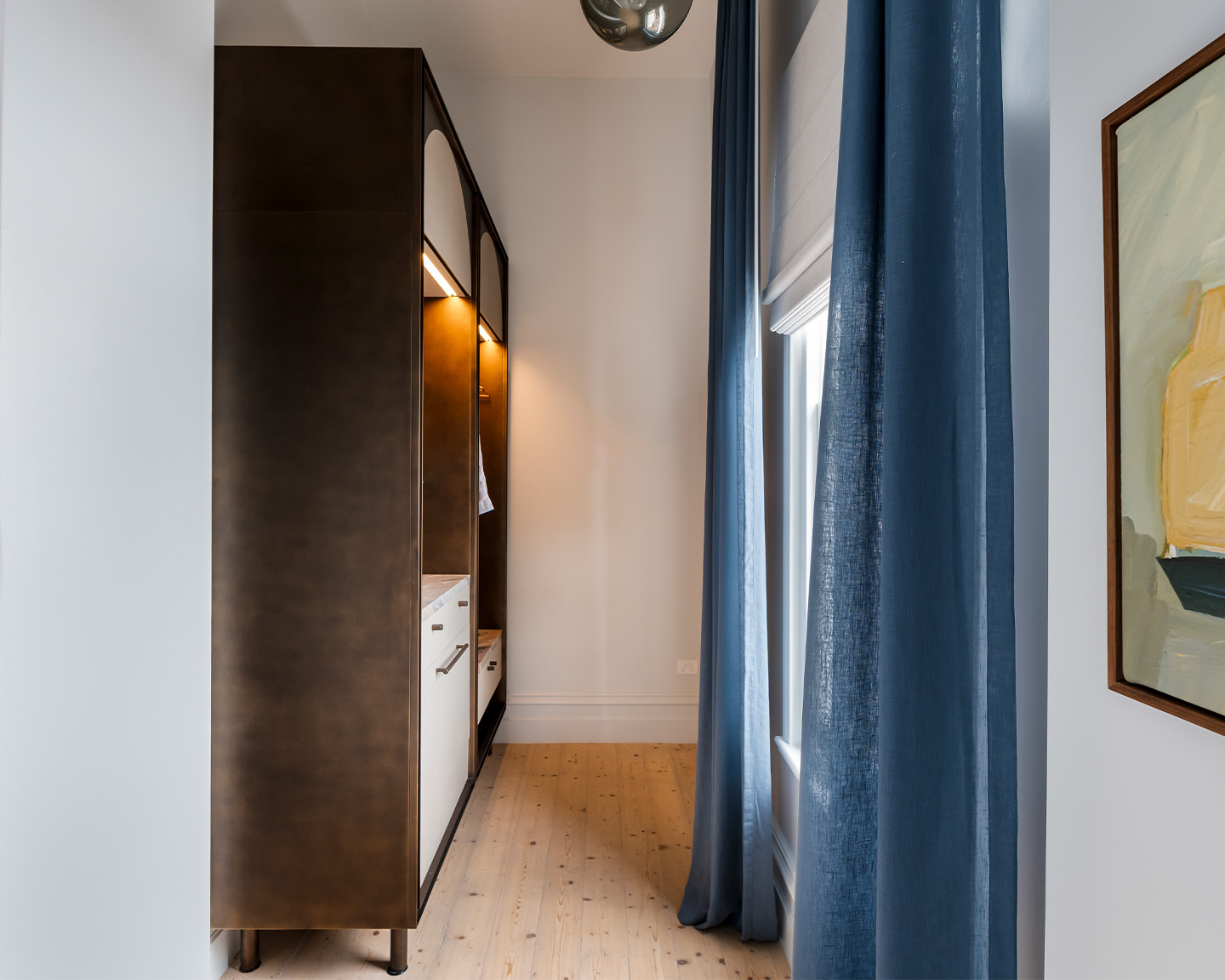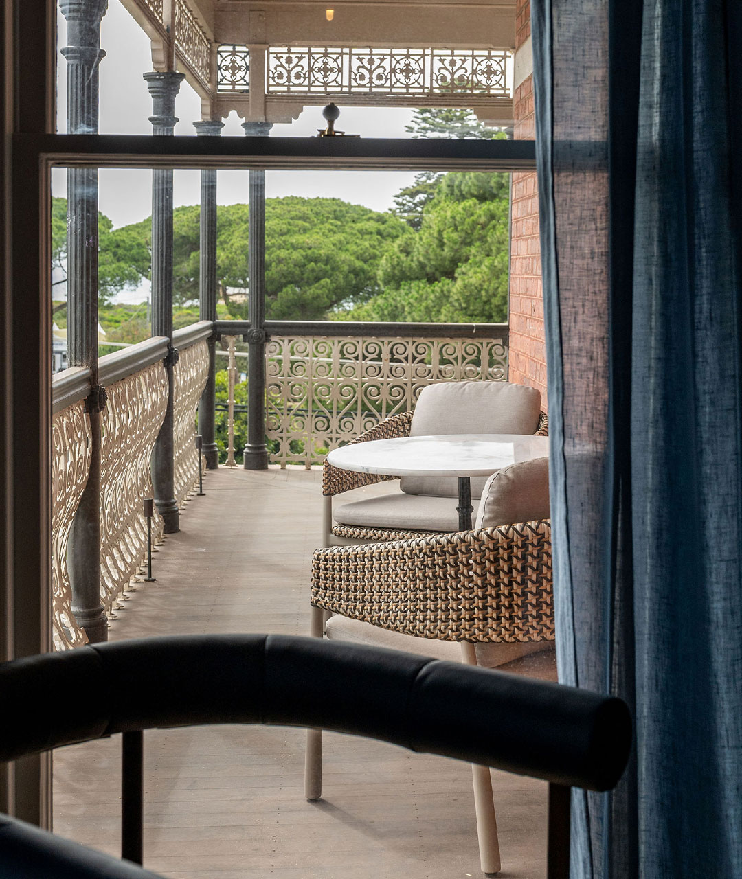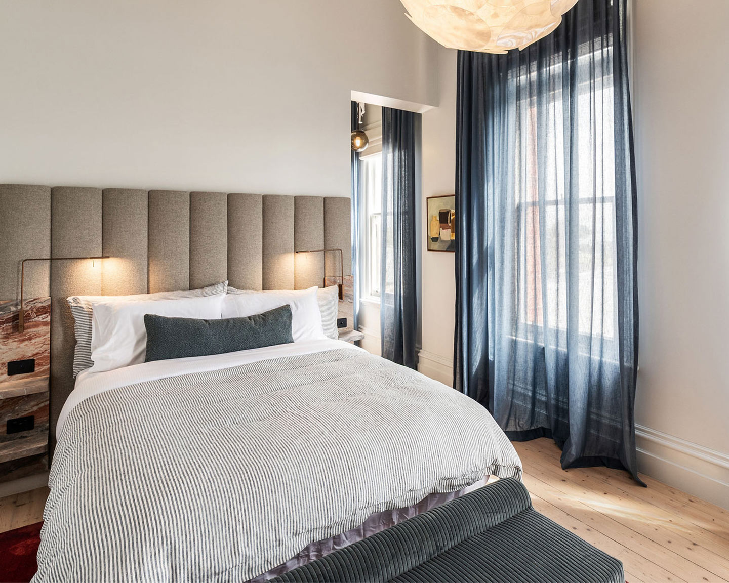 Step through a grand bespoke window to your private verandah, perfect for morning coffee or sunset reflections. Inside, a beautifully restored original fireplace adds a warm touch, while a spacious walk-in robe provides both elegance and practicality for longer stays.