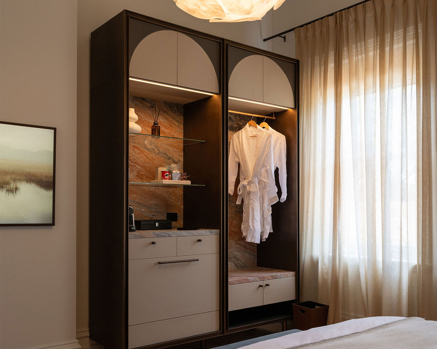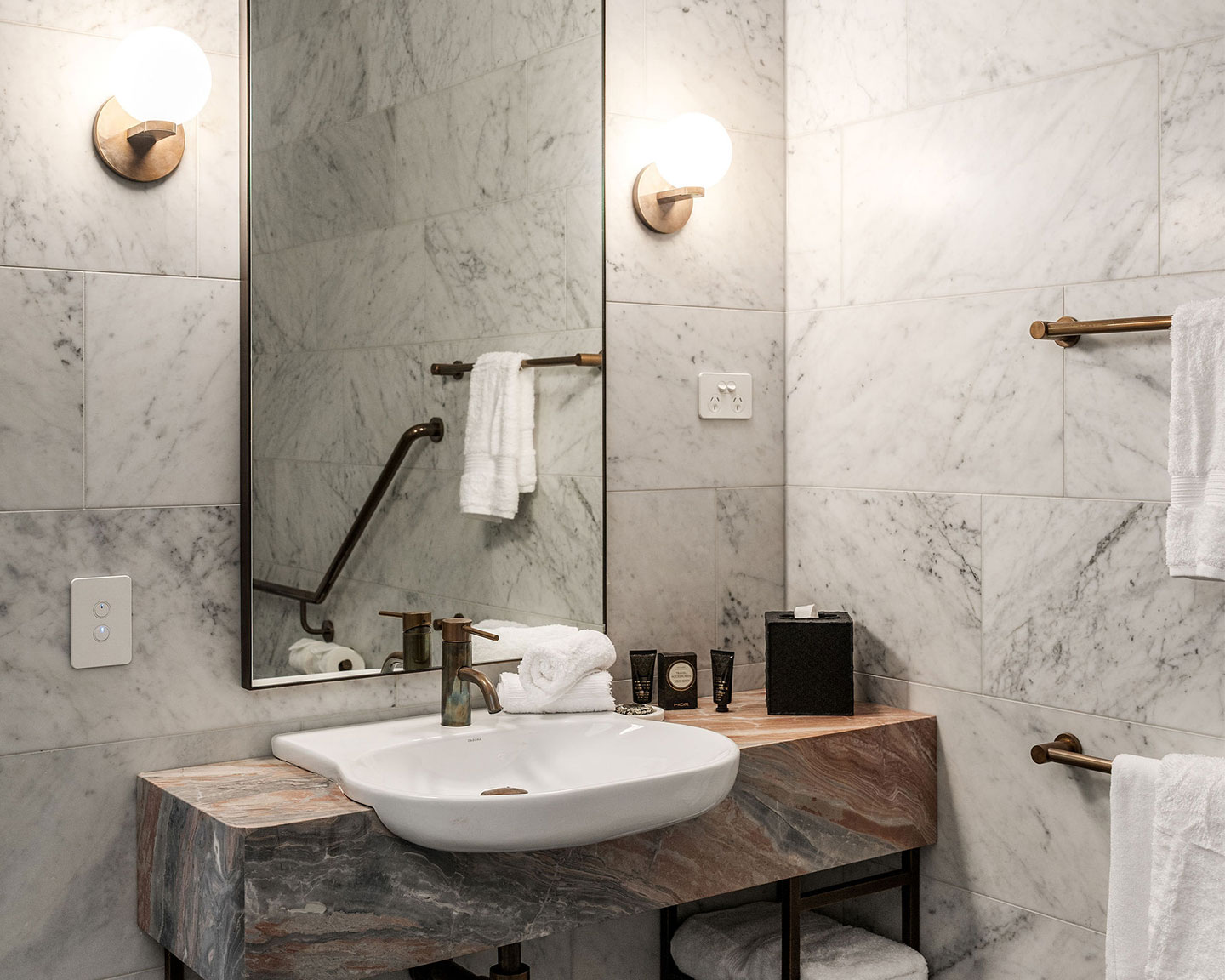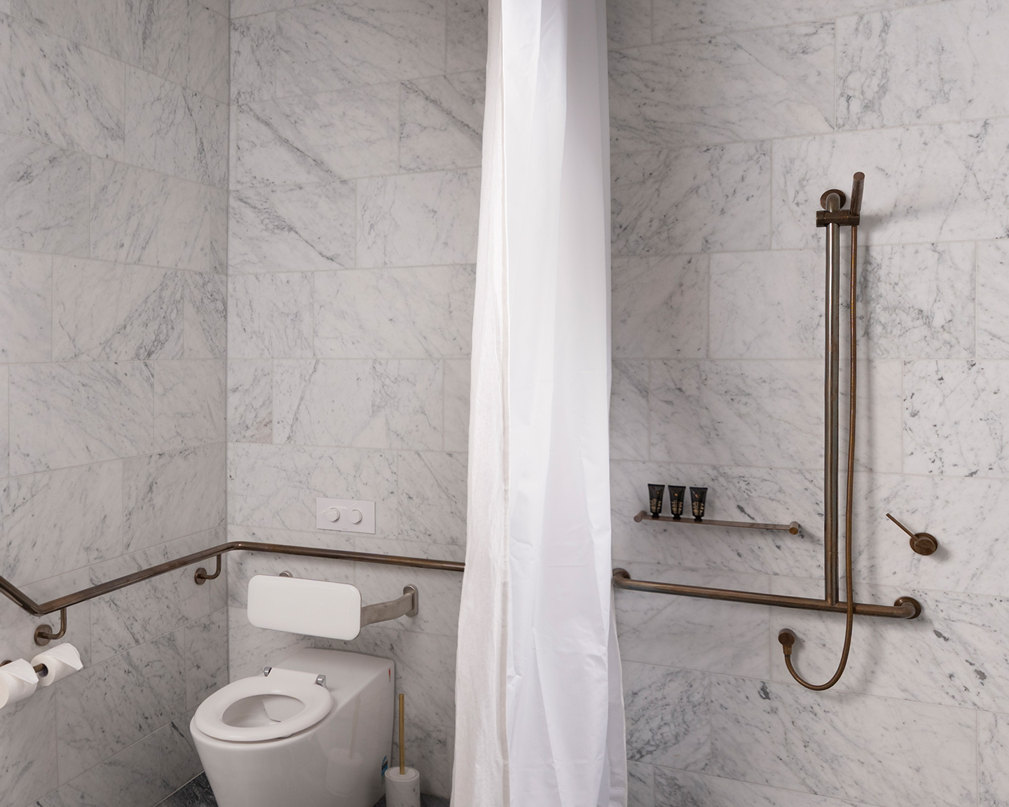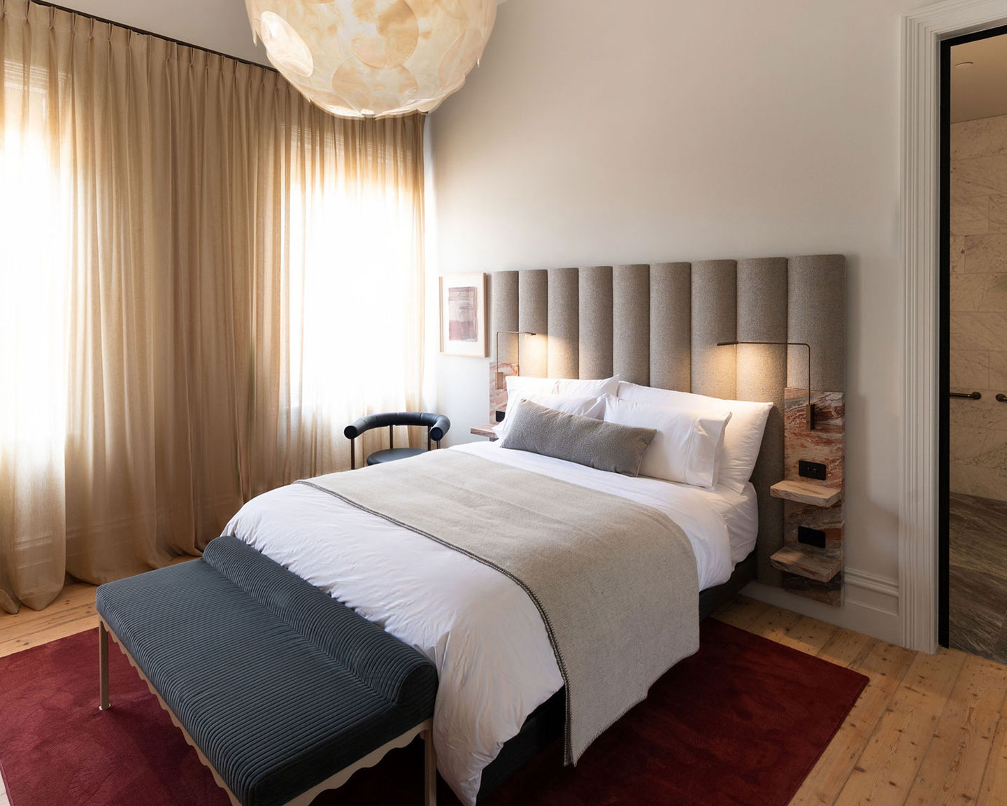 The room is styled with a calming, breezy feel and includes our signature marble and bronze bathroom, complete with accessible fittings. Bespoke cabinetry and considered details throughout ensure a luxurious and inclusive experience for every traveller.